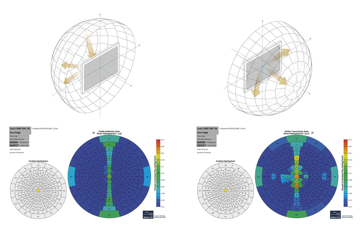 We can perform optical and thermal characterisation of materials as well as performance simulations and optimisations of materials, composites, systems and buildings. For laboratory optical characterisation of materials we use a spectrophotomer (UV-VIS-NIR). For optical analysis we use LBNL WINDOW, OPTICS, THERM as well as other more advanced software for fluid dynamic simulation. In addition to the standard analysis and simulations we create automated workflows and optimisations to explore design search space. In special cases we also develop our own software such as Stingray - raytracing plugin for Grasshopper and Rhino 3D.