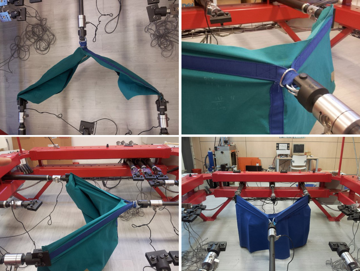 The biaxial machine has been designed and built with a high degree of adaptability, combining the different skills of involved researchers with different test configurations: it is possible to test different sizes of samples and high variation of polymeric films. The wide range of forces and transversal movement of engines allows to test different materials, from technical textiles or carbon fibres composites employed in construction field, which should withstand high loads, to biomedical tissues, which are tested in small samples and support lower stresses. The samples are fixed to the bars by means of special clamping system, which allows testing models from 10 to 100 cm of wide. The particular configuration of the biaxial rig offers freedom to test samples in mono- or bi- axial traction, but also other types of systems not compliant with the traditional models (e.g. mono- and biaxial test campaigns or biaxial tests for compensation value, for E-modulus investigation), as follows.
