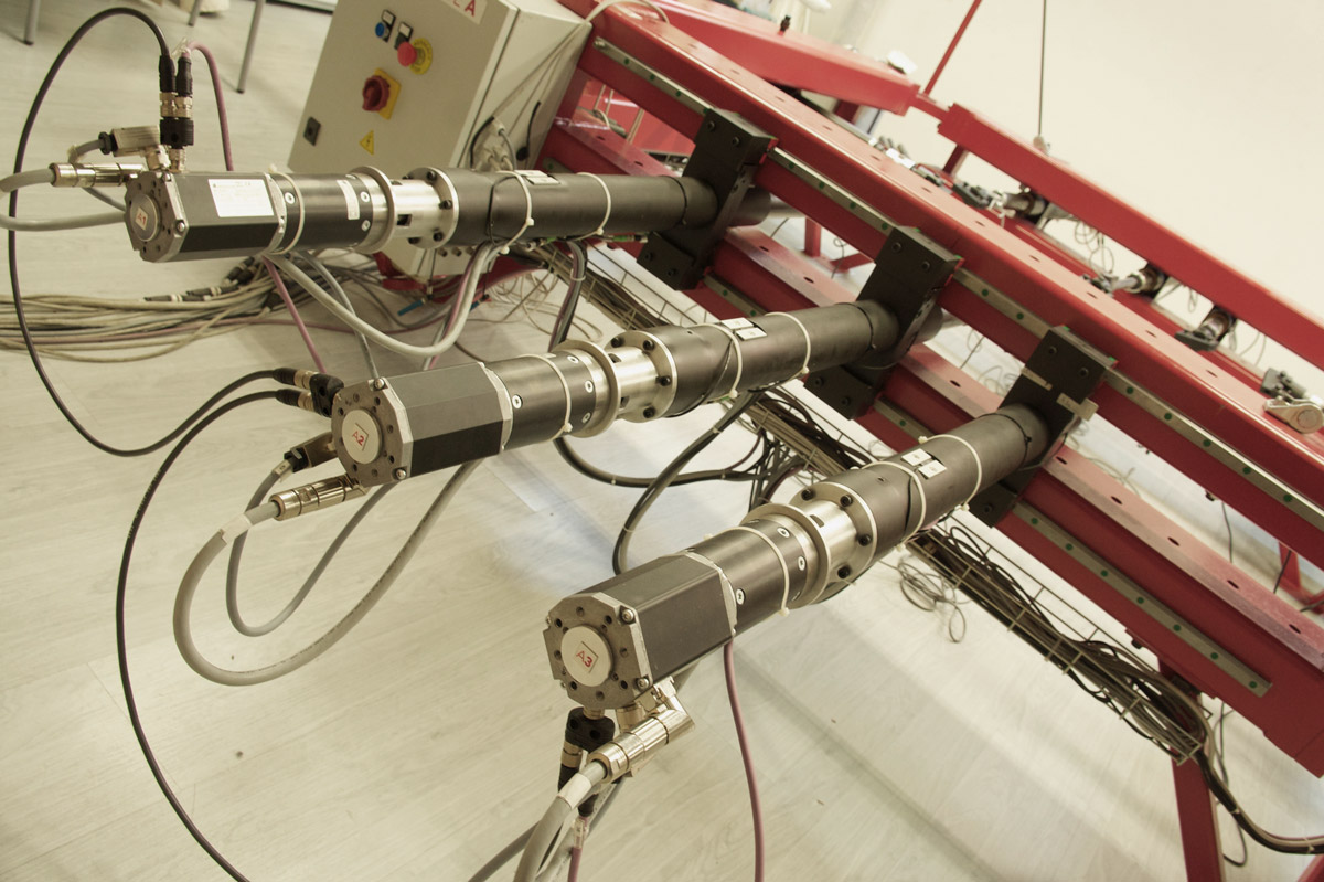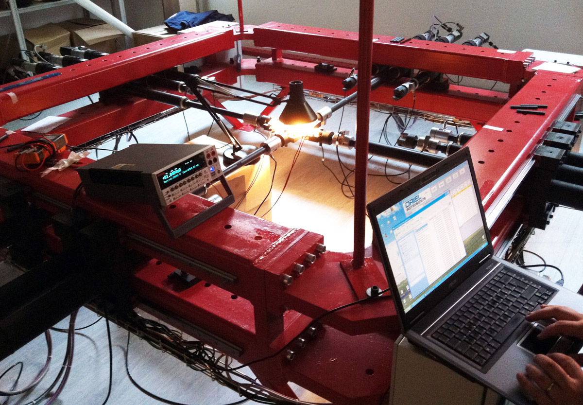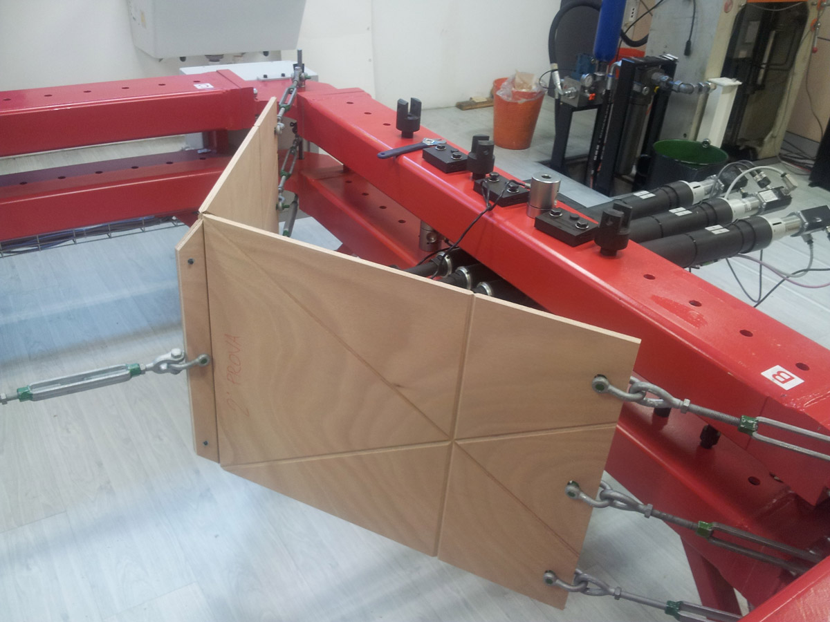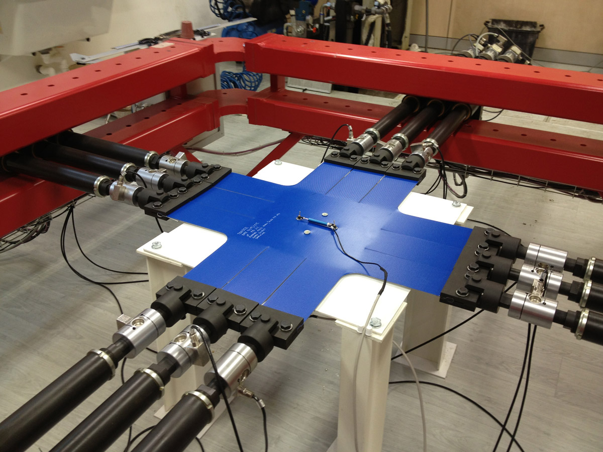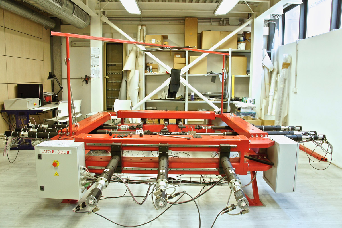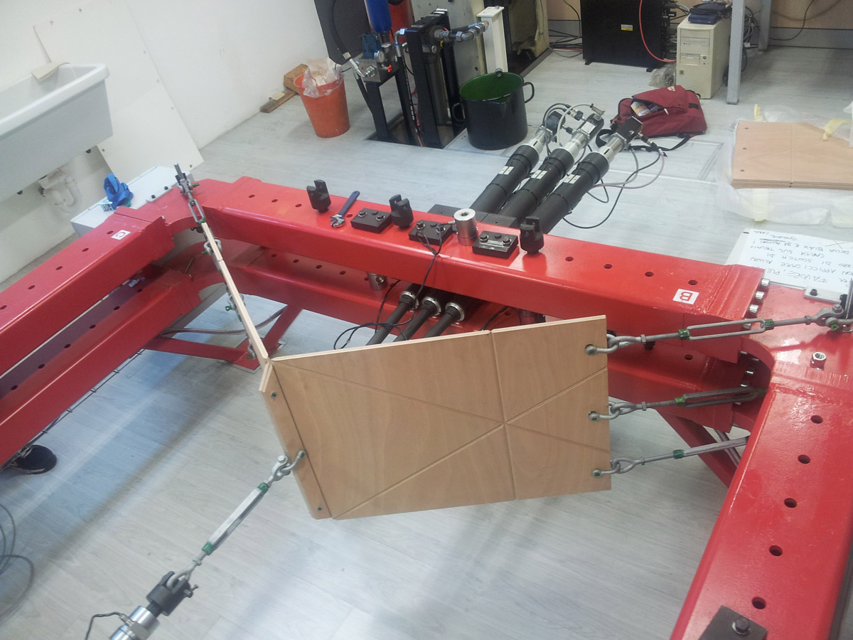 Both uniaxial and biaxial tensile tests can be performed with the biaxial rig set up on two squared steel frames, designed for an estimated maximum force of 175kN on each side. The actuators are based on a brushless motor, equipped with an absolute encoder. The maximum speed is 240 mm/min and the positioning resolution is equal to +/- 0.05 mm. Each actuator is equipped with a force transducer, which measures the force applied, allowing accurate control of the linear displacements of the actuator. The force transducers have been calibrated following the Quality System of the Politecnico di Milano.