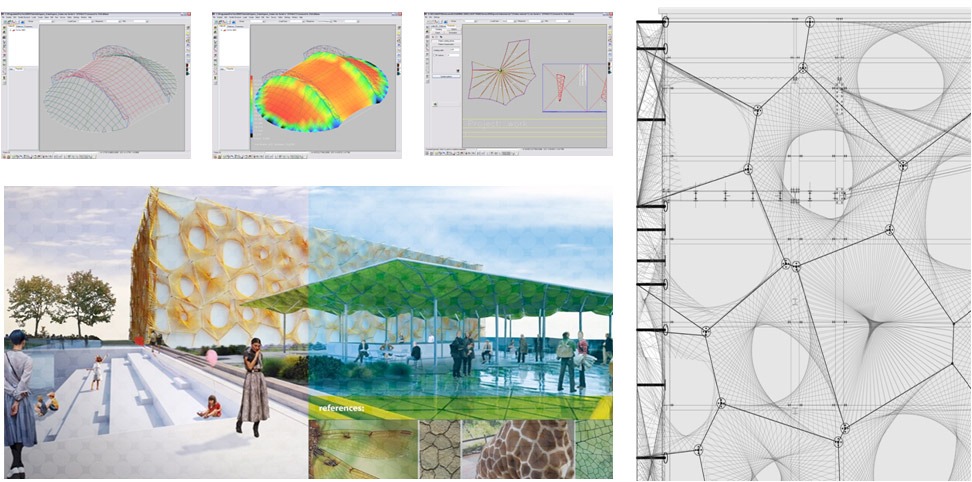 Our design process includes the most advanced methods for form finding, structural analysis, cutting pattern, paneling, parametric modeling, computational design, simulation and optimisation. The design and the experimental process are supported among others with the following software:
