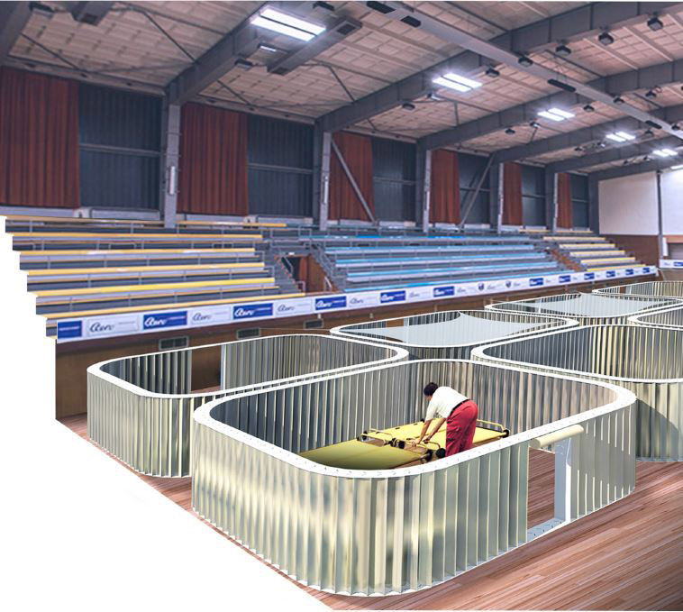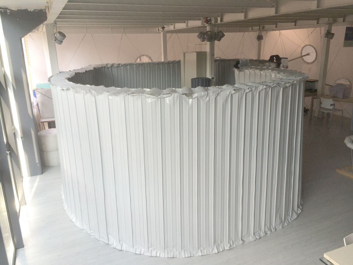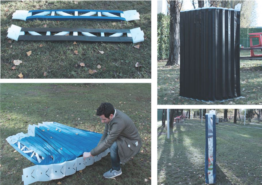 Textile Wall is a flexible easily-packable cell panel component for creating instantly self-stabilising partitions, made of semi-rigid bars stitching two textile which can be filled with debris or other locally available materials. This component is ultra-lightweight and easy to handle, foldable as a concertina and fillable with locally available materials. Especially suitable for reconstruction / repair of existing buildings, both walls and inclined roofs ways. The general idea of S(p)eedkits is providing divided components (e.g. roofs, flooring, freely-configurable walls and cocoons as isolated rooms) leaves the local population with components which do not quickly become refuse, but rather durable materials that can be reused in keeping with their habits and integrated with local materials.